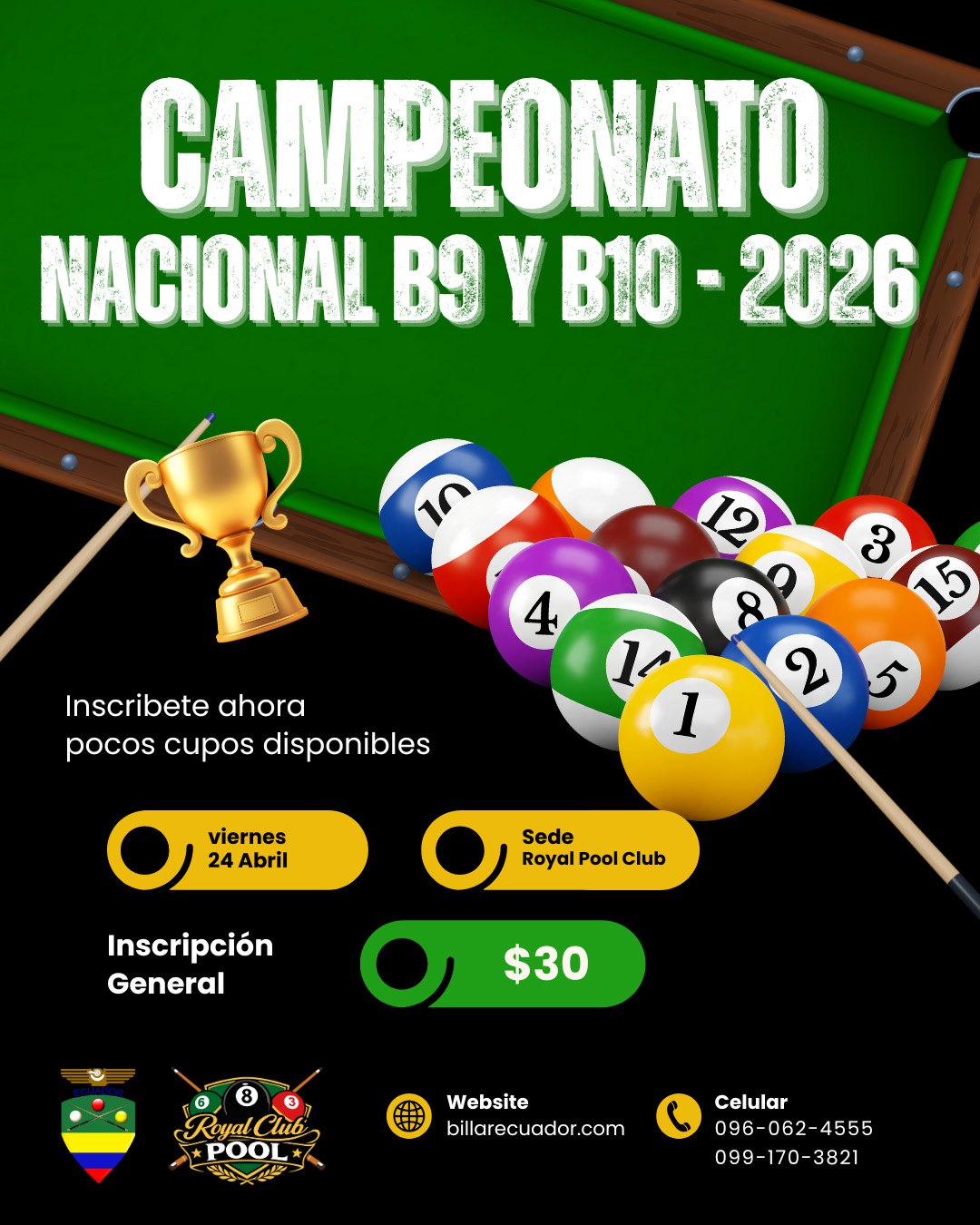 La Federación Ecuatoriana de Billar, en alianza estratégica con Royal Pool Club – Guayaquil, convoca a todos los jugadores del país al Campeonato Nacional de Pool Modalidades Bola 9 y Bola 10, a disputarse los días 24, 25 y 26 de abril, los cuales otorgaran puntos ranking nacional e internacional. Se sumarán todos los puntos obtenidos en los circuitos, y los cuatro mejores puntuados obtendrán un cupo al cuadro principal del Campeonato Panamericano de Pool que se realizara en la ciudad de Panama, a todos los participante se le otorgara carnet digital de la Federación Ecuatoriana de Billar por lo que estará debidamente registrado y federado.